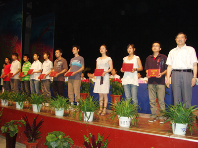 王旭善向十个系(院)的毕业生代表颁发了毕业证书。我校对朱贤美等42名优秀毕业生颁发了荣誉证书,为李春风等11名西部计划、苏北计划志愿者赠送了纪念品。
