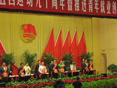 5月4日,徐州市纪念五四运动90周年暨推进青年就业创业大会在新城区会议中心小礼堂隆重召开。我校团委被授予“徐州市五四红旗团委”荣誉称号,电子信息工程系团总支被授予“徐州市五四红旗团总支”称号,人文与社会科学系文秘06-2班团支部被授予“徐州市五四红旗团支部”称号,陈昕、李国琴等6名先进个人受到表彰。