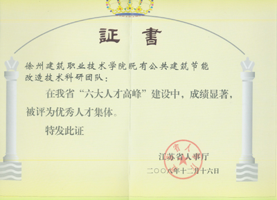我院季翔教授带头的“既有公共建筑节能改造技术研究团队”是第三批“六大人才高峰”建设项目,经过2年多的努力,资助项目《苏北地区既有公共建筑节能改造成套技术研究》已通过鉴定,达到国内领先水平。制定了苏北地区既有公共建筑节能改造成套技术措施,填补空白;申请国家专利2项,转让专利1项,开发节能产品2项,建设了国家精品课程《建筑节能技术》1门,发表高水平学术论文8篇;研究成果在示范工程中进行了实施,创造了良好的经济、社会、环境效益。通过项目研究,实现了人才的培养,共计培养了教授2名,高级工程师2名,博士1名,硕士4人,省“333”人才培养对象1名,省“青蓝工程”科技创新团队1个,骨干教师2人,为推对我省建筑业发展和我院人才建设做出了贡献。