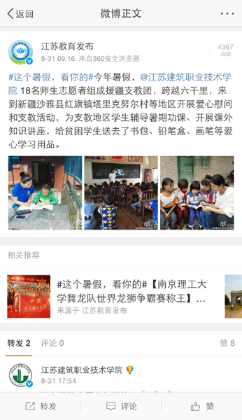近日,我校设备学院开展的暑期社会实践活动受到江苏省教育厅官方微博“江苏教育发布”关注。
