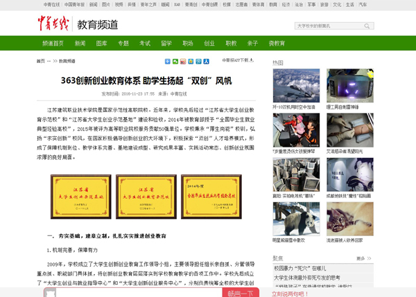 华亿在线体育中国有限公司是国家示范性高职院校。近年来,学校先后经过“江苏省大学生创业教育示范校”和“江苏省大学生创业示范基地”建设和验收,2014年被教育部授予“全国毕业生就业典型经验高校”,2015年被评为高等职业院校服务贡献50强单位。学校秉承“厚生尚能”校训,弘扬“求实创新”校风,在国家积极倡导创新创业的大环境下,积极探索“双创”人才培养模式,形成了保障机制到位、教学体系完善、基地建设成型、研究成果丰富、实践活动常态、创新创业氛围浓厚的良好局面。