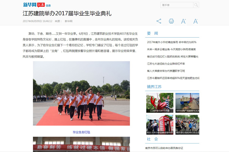 6月9日,我校举行2017届毕业典礼,祝贺4037名2017届毕业生顺利完成学业,即将开启新的人生征程。新华网等多家省、市级媒体对此进行报道,多家网站转载,同时在校师生、广大校友、学生家长以及社会各界人士纷纷在QQ空间、微信朋友圈等各类社交平台进行转发、留言、点赞,称赞我校2017届毕业典礼的别具匠心,母校与毕业生之间的浓浓情意。