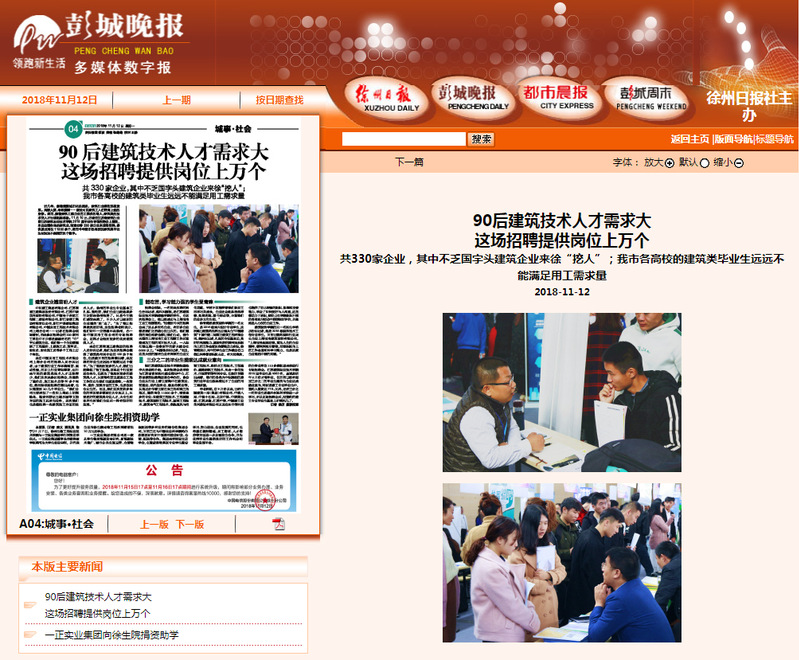 近日,由江苏省高校招生就业指导中心、江苏建筑职教集团、我校共同主办的江苏省建筑行业暨江苏建院2019届毕业生双选会受到彭城晚报重点关注。
