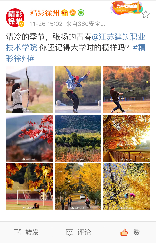 时至深秋,苏建院校园内美景如织,受到“江苏教育发布”等多家媒体的关注。