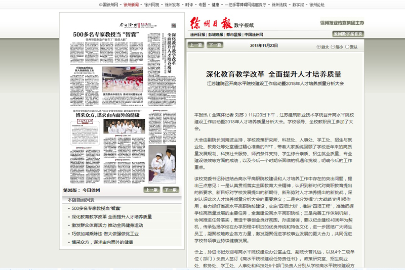 11月23日,《徐州日报》报道我校召开高水平院校建设工作启动暨2018年人才培养质量分析大会。