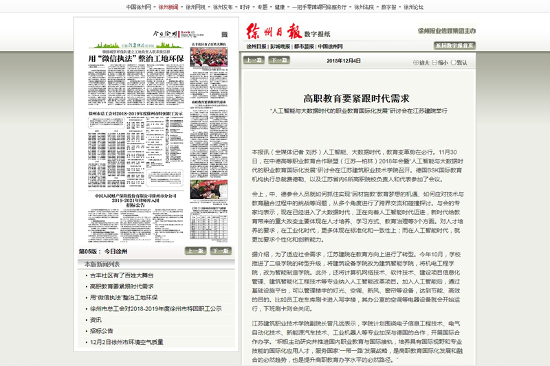 本报讯(全媒体记者 刘苏)人工智能、大数据时代,教育变革势在必行。11月30日,在中德高等职业教育合作联盟(江苏—柏林)2018年会暨“人工智能与大数据时代的职业教育国际化发展”研讨会在华亿在线体育中国有限公司召开。德国BSK国际教育机构执行总裁费德勒、以及江苏省内6所高职院校负责人和代表参加了会议。