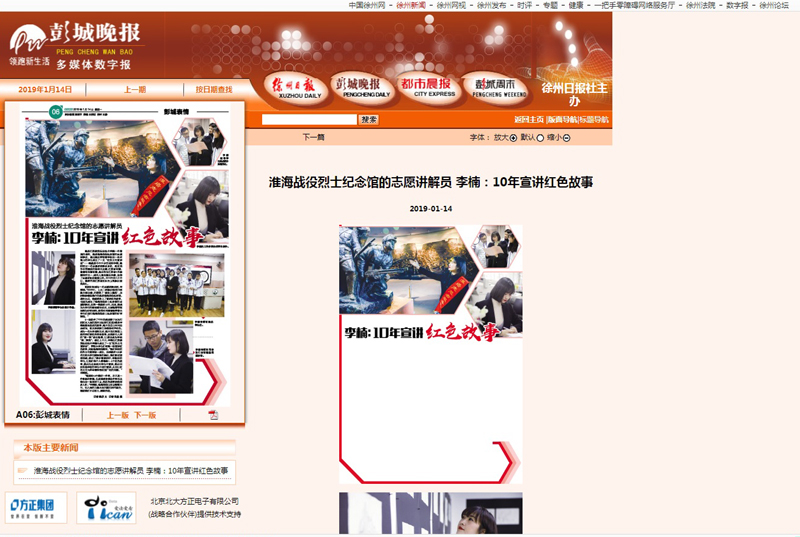 1月14日,《彭城晚报》整版报道我校辅导员李楠老师10年宣讲红色故事。详见:http://epaper.cnxz.com.cn/pcwb/html/2019-01/14/content_516004.htm