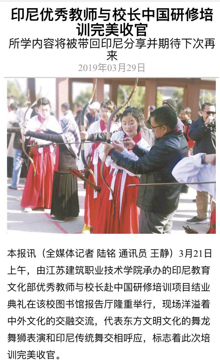参训学员、雅加达第六公立职业学校校长薇薇科在接受记者采访时表示,此次培训的教室环境、课堂组织非常好,她印象最深的是江苏建筑学院的射艺场,这个射艺场不仅培养学生射艺知识,还包括传统文化的体验。