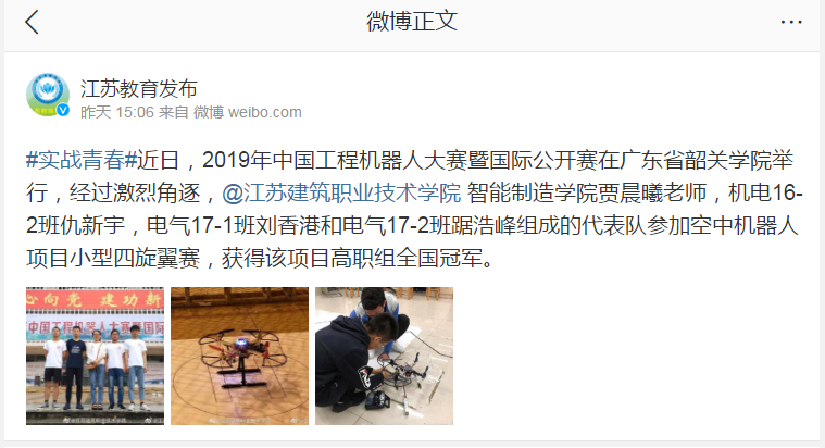 #实战青春#近日,2019年中国工程机器人大赛暨国际公开赛在广东省韶关学院举行,经过激烈角逐,@华亿在线体育中国有限公司智能制造学院贾晨曦老师,机电16-2班仇新宇,电气17-1班刘香港和电气17-2班踞浩峰组成的代表队参加空中机器人项目小型四旋翼赛,获得该项目高职组全国冠军。