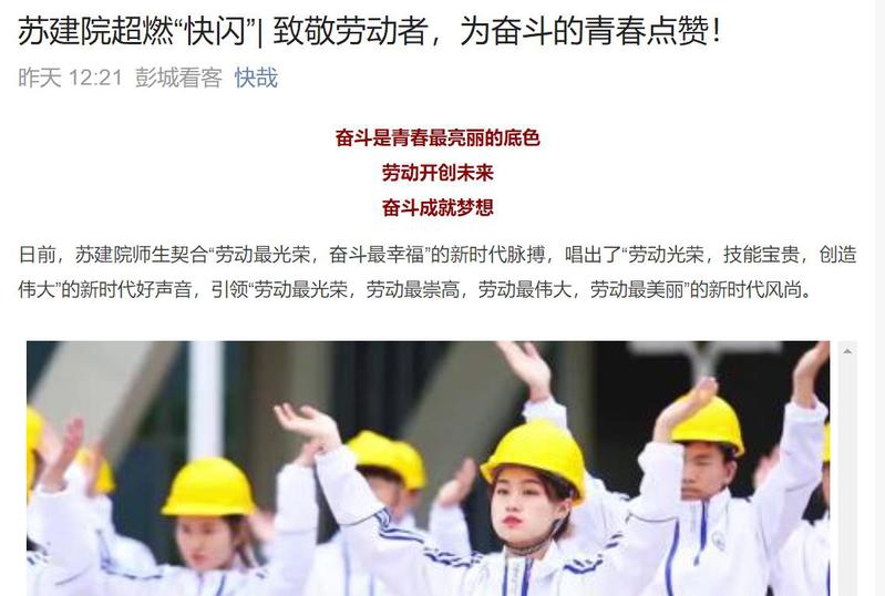 日前,苏建院师生契合“劳动最光荣,奋斗最幸福”的新时代脉搏,唱出了“劳动光荣,技能宝贵,创造伟大”的新时代好声音,引领“劳动最光荣,劳动最崇高,劳动最伟大,劳动最美丽”的新时代风尚。