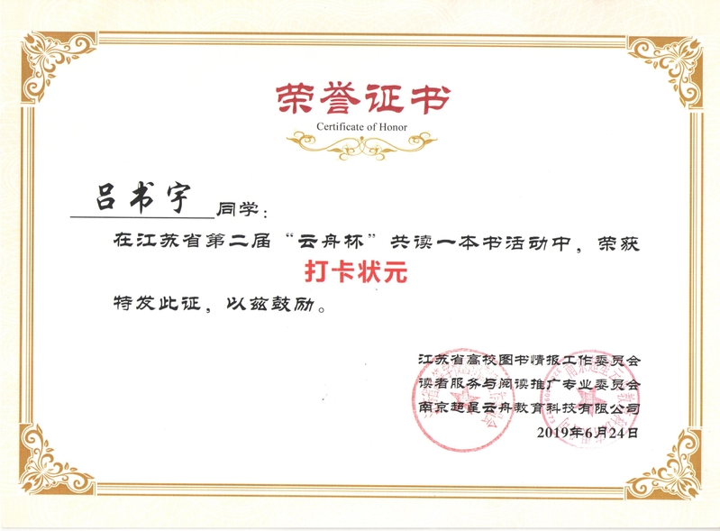 近日,江苏省高校图工委读者服务与阅读推广专委会在全省高校系统内组织的第二届江苏省高校“云舟杯”共读一本书活动结果揭晓,我校学子吕书宇荣获“打卡状元”、黄如玉荣获“三等奖”。