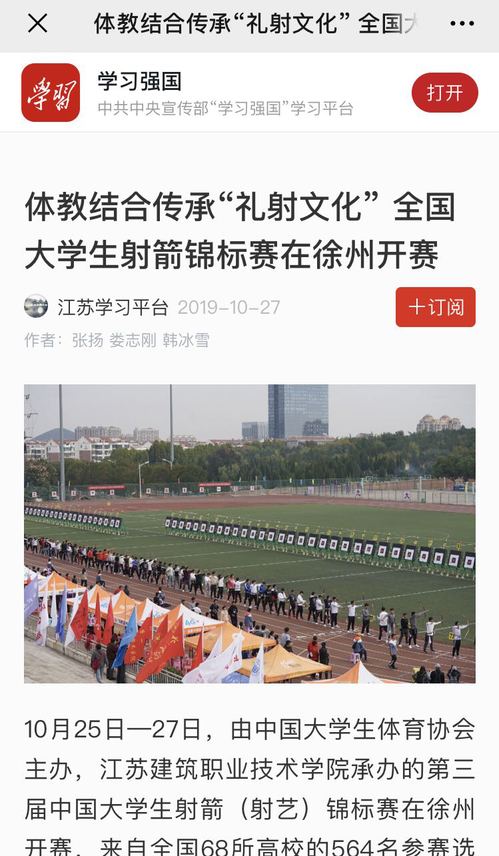 近年来,江苏建院先后成立射艺队、建立礼射场、举办亚洲首届礼射研讨会、筹建礼射展览馆,将传统文化融入校园文化建设,将传统体育文化融汇到学生教育培养中,用“射以观德”的民族传统培育新时代精益求精的“大国工匠”。