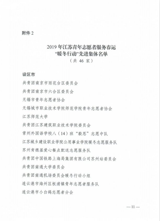 近日,团省委、省工信厅、省公安局、省交通运输厅联合对2019年江苏青年志愿者服务春运“暖冬行动”先进集体进行了评选表彰,我校团委荣获“江苏青年志愿者服务春运暖冬行动先进集体”荣誉称号。