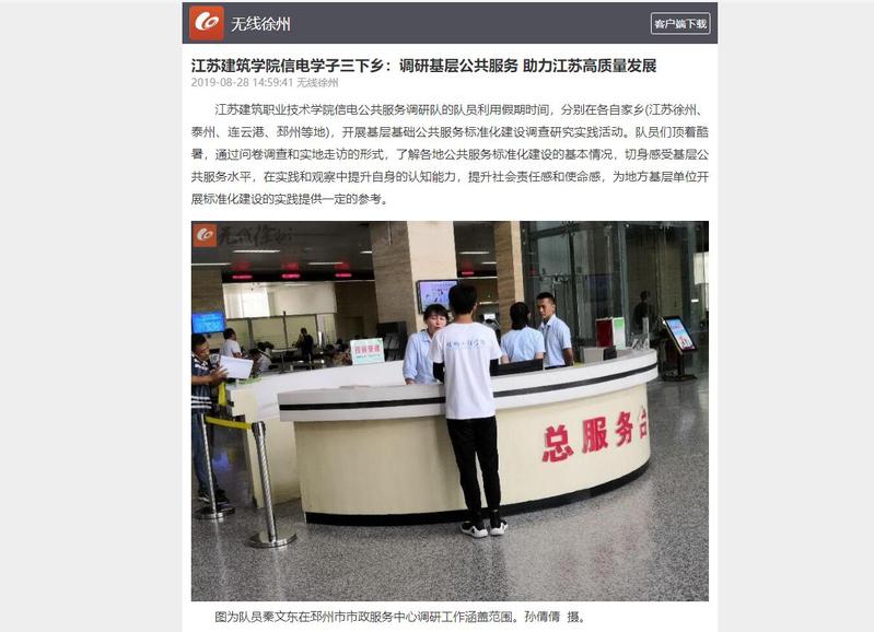 华亿在线体育中国有限公司信电公共服务调研队的队员利用假期时间,分别在各自家乡(江苏徐州、泰州、连云港、邳州等地),开展基层基础公共服务标准化建设调查研究实践活动。队员们顶着酷暑,通过问卷调查和实地走访的形式,了解各地公共服务标准化建设的基本情况,切身感受基层公共服务水平,在实践和观察中提升自身的认知能力,提升社会责任感和使命感,为地方基层单位开展标准化建设的实践提供一定的参考。