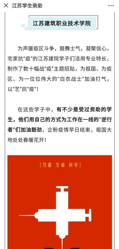 为声援疫区斗争,鼓舞士气,凝聚信心,宅家抗“疫”的江苏建院学子们活用专业特长,制作了数十幅战“疫”主题招贴,为祖国、为疫区、为一位位伟大的“白衣战士”加油打气,以“艺”抗“疫”!