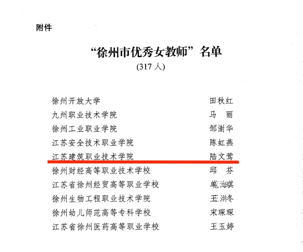 近日,值第110个“三八”国际劳动妇女节来临之际,徐州市教育局、徐州市妇女联合会联合在全市范围内开展“徐州市优秀女教师”评选活动,经过民主推荐、公开评选等程序,我校建筑装饰学院陆文莺老师荣获“徐州市优秀女教师”称号。