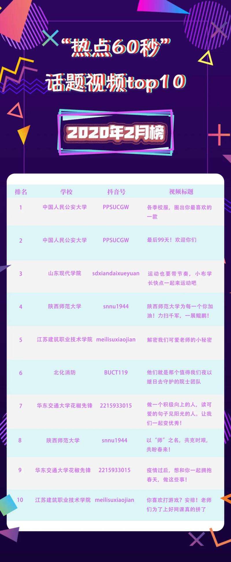 中国大学生在线综合投稿量、播放量、点赞量、评论量、分享数、增粉数等多个数据维度,对高校及高校短视频进行遴选,发布“全国高校短视频传播力”top排行榜2月榜(10件短视频)、“全国本科院校抖音号综合影响力”排行榜2月榜(30所高校)、“全国高职院校抖音号综合影响力”排行榜2月榜(30所高职院校)、“全国高校抖音号‘热点60秒’话题视频top10”排行榜2月榜(10件短视频)。