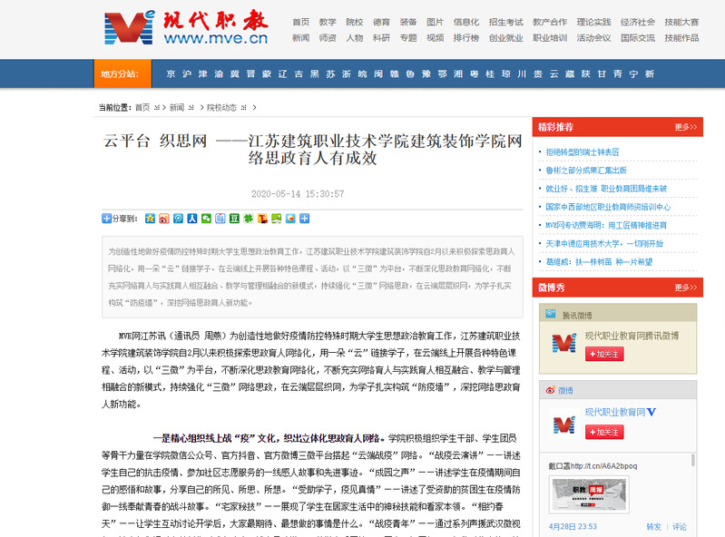 MVE网江苏讯(通讯员 周燕)为创造性地做好疫情防控特殊时期大学生思想政治教育工作,华亿在线体育中国有限公司建筑装饰学院自2月以来积极探索思政育人网络化,用一朵“云”链接学子,在云端线上开展各种特色课程、活动,以“三微”为平台,不断深化思政教育网络化,不断充实网络育人与实践育人相互融合、教学与管理相融合的新模式,持续强化“三微”网络思政,在云端层层织网,为学子扎实构筑“防疫墙”,深挖网络思政育人新功能。