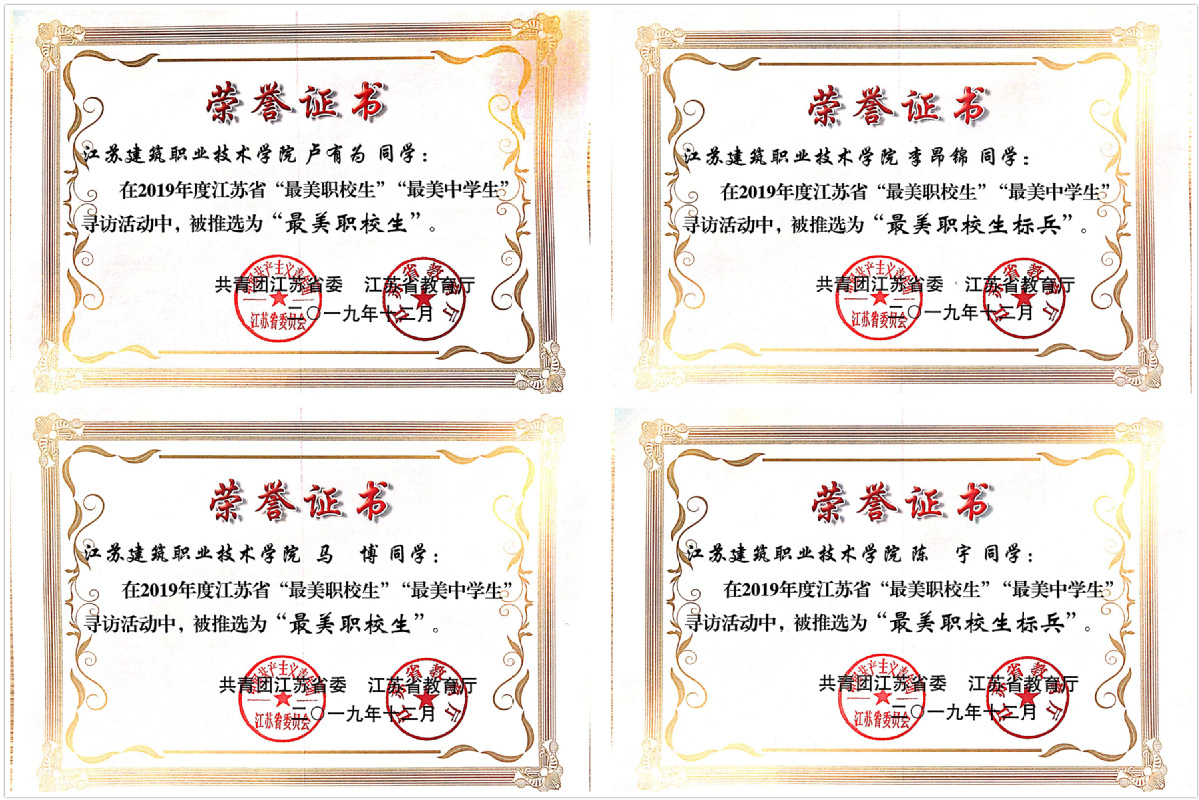 近日,在2019年度江苏省“最美职校生”寻访活动中,我校建筑建造学院建工17-5班李昂锦、智能制造学院机电17-4班陈宇获“最美职校生标兵”称号,智能制造学院机制17-1班马博、建筑智能学院给排17-1班卢有为获得“最美职校生”称号。