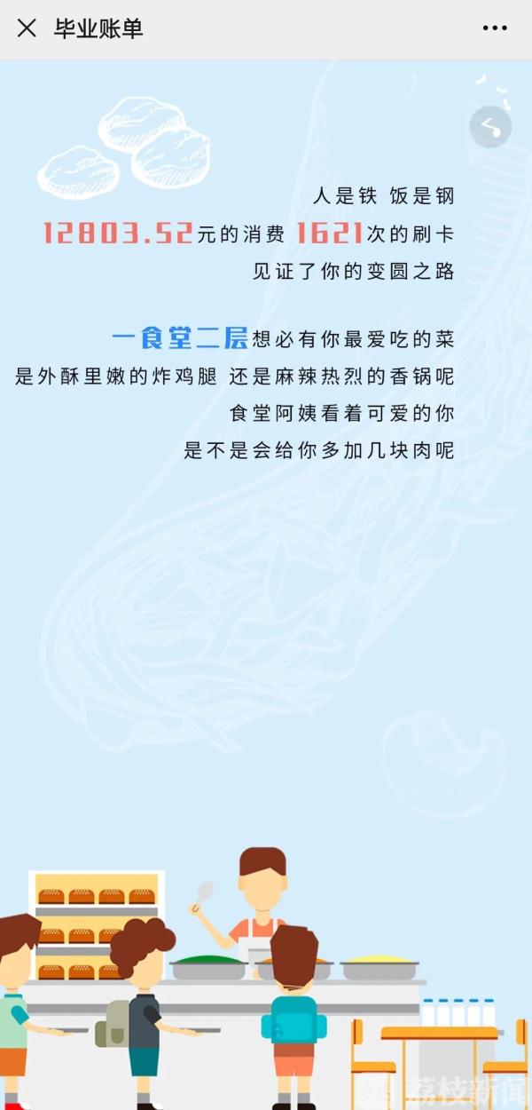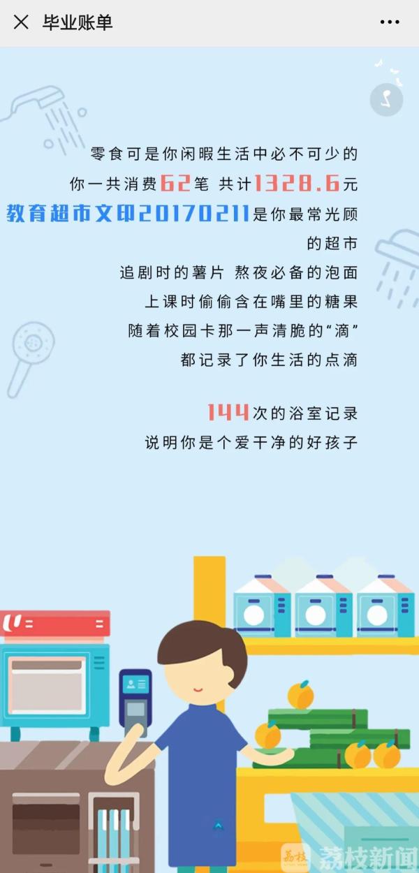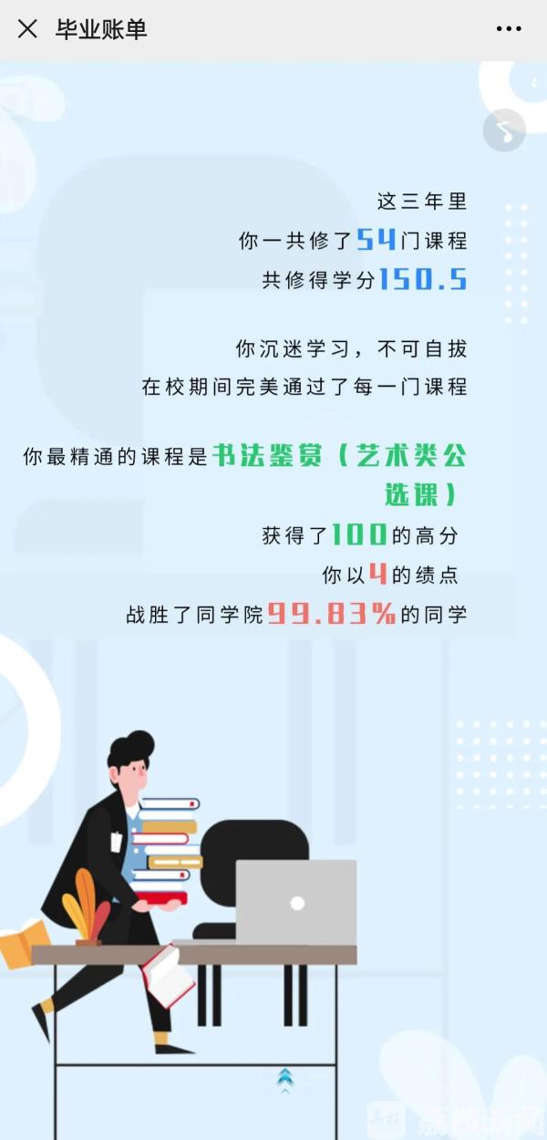 “我们学校考虑得太细致了,每人还量身定做了校园毕业账单,你看,就是类似于支付宝的年度账单,没想到学校从我们的学习、生活各个角度通过大数据分析得如此精确。”毕业生李卓,向记者展示了学校推送给每位毕业生的毕业账单。
