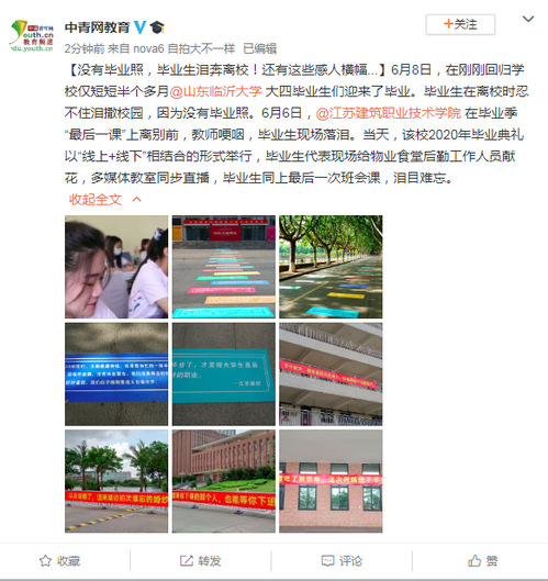 【没有毕业照,毕业生泪奔离校!还有这些感人横幅...】6月8日,在刚刚回归学校仅短短半个多月@山东临沂大学 大四毕业生们迎来了毕业。毕业生在离校时忍不住泪撒校园,因为没有毕业照。6月6日,@华亿在线体育中国有限公司 在毕业季“最后一课”上离别前,教师哽咽,毕业生现场落泪。当天,该校2020年毕业典礼以“线上+线下”相结合的形式举行,毕业生代表现场给物业食堂后勤工作人员献花,多媒体教室同步直播,毕业生同上最后一次班会课,泪目难忘。