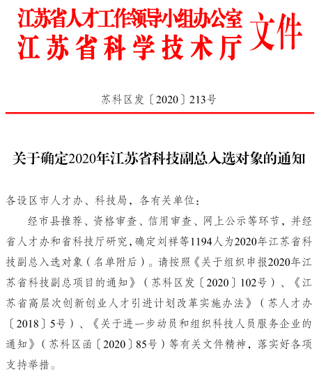 近日,江苏省人才办和科技厅发布了《关于确定2020年江苏省科技副总入选对象的通知》(苏科区发〔2020〕213号),公布了2020年江苏省“双创计划”科技副总入选对象,我校陶祥令博士入选。