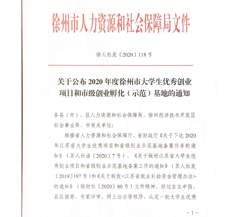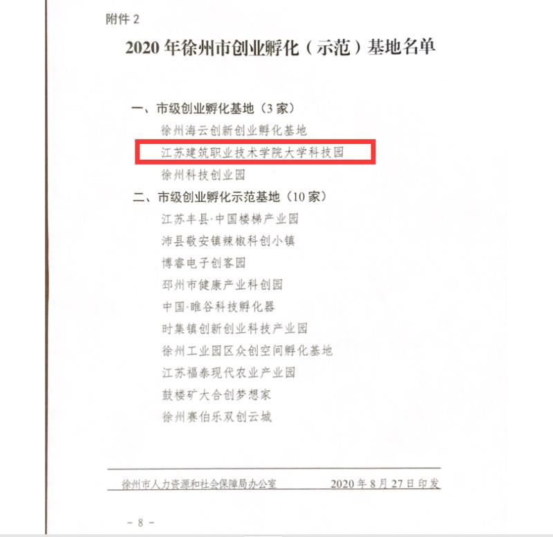 9月1日,徐州市人力资源和社会保障局网站公布,我校大学科技园被认定为2020年徐州市市级创业孵化(示范)基地。