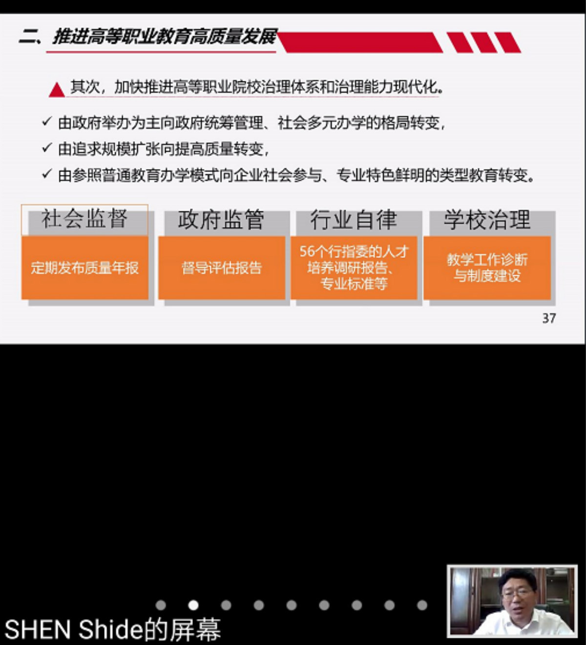 沈士德以《以改革促发展,吃透政策推动职业教育提质升级》为题,从三个方面介绍了中国特色的职业教育体系、推进高职教育高质量发展和高职国际化办学服务“一带一路”内容。在互动问答环节中,他回答了培训班成员提出的涉及中国的职教20条、校企合作创新模式、教师发展与评估考核、校企科研创新及疫情期间的中国基础教育与高等教育在线课程开放等方面的问题。两个小时的讲座获得了热烈反响。