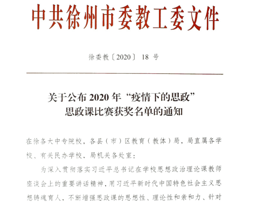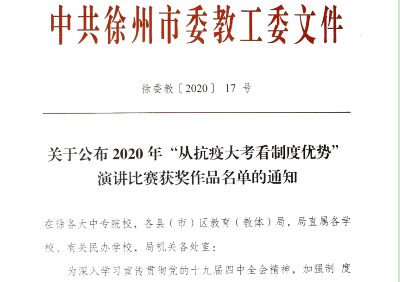 近日,徐州市教育工委公布了“疫情下的思政”为主题的全市教育系统思政课比赛和“从抗疫大考看制度优势”演讲比赛结果,我校两项作品均在活动中获奖。