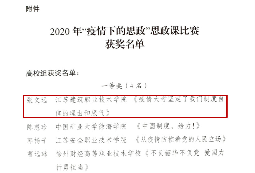 我校报送的马克思主义学院张文远老师的《疫情大考坚定了我们制度自信的理由和底气》获全市教育系统思政课比赛高校组一等奖;装饰18-3许家琛、装饰19-1王夫恩的演讲作品《全民战“疫”,点赞中国》获“从抗疫大考看制度优势”演讲比赛活动学生组二等奖。