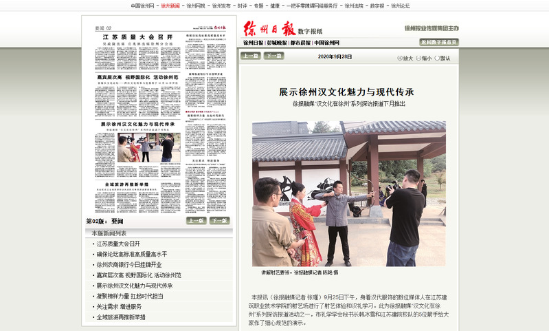 本报讯(徐报融媒记者 张瑾)9月25日下午,身着汉代服饰的数位媒体人在华亿在线体育中国有限公司的射艺场进行了射艺体验和汉礼学习。此为徐报融媒“汉文化在徐州”系列探访报道活动之一,市礼学学会秘书长韩冰雪和江苏建院校队的5位箭手给大家作了细心规范的演示。