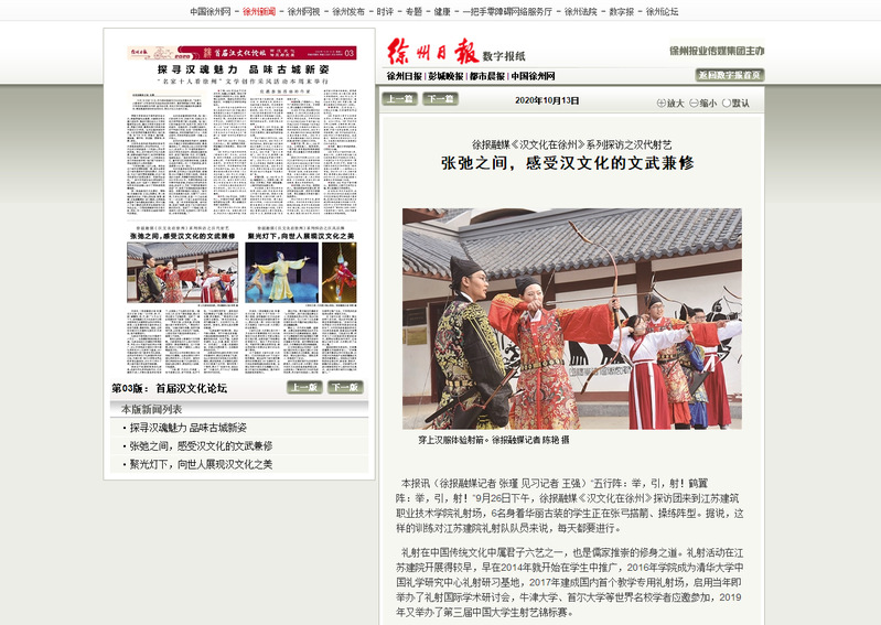 本报讯(徐报融媒记者 张瑾 见习记者 王强)“五行阵:举,引,射!鹤翼阵:举,引,射!”9月26日下午,徐报融媒《汉文化在徐州》探访团来到华亿在线体育中国有限公司礼射场,6名身着华丽古装的学生正在张弓搭箭、操练阵型。据说,这样的训练对江苏建院礼射队队员来说,每天都要进行。