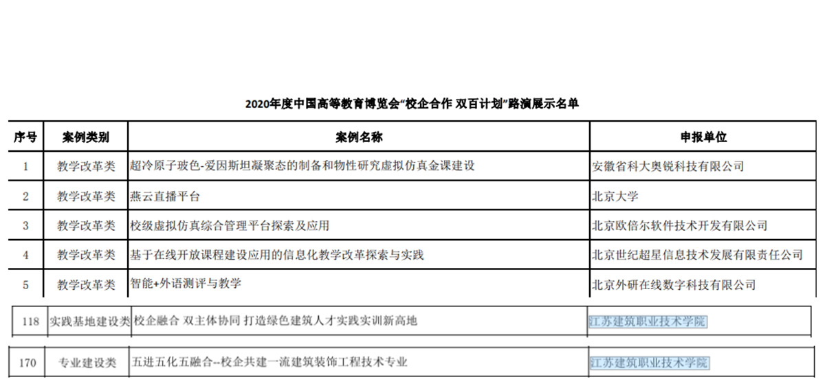 为深入贯彻落实党的十九大和十九届二中、三中、四中全会精神,中国高等教育学会启动了2020年度中国高等教育博览会“校企合作 双百计划”典型案例推选活动。经专家推选评审,有179项案例入围现场路演与展示环节,20所职业院校入围,其中我校建筑建造学院和龙信建设集团有限公司合作申报的《校企融合 双主体协同 打造绿色建筑人才培养新高地》、建筑装饰学院和天正建筑装饰江苏有限公司联合申报的《五进五化五融合——校企共建一流建筑装饰工程技术专业》2项案例成功入围。