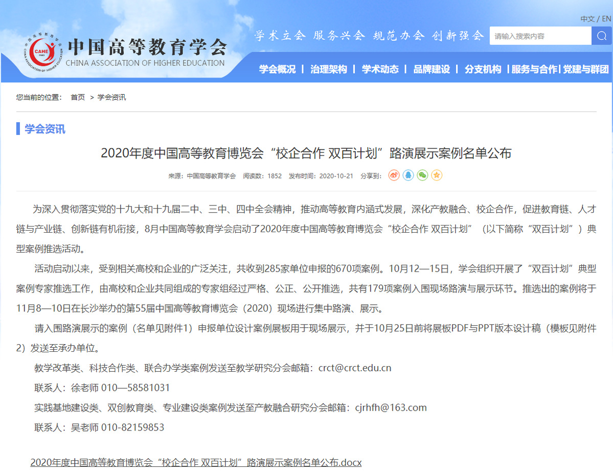 10月21日,中国高等教育学会官网公布2020年度中国高等教育博览会“校企合作 双百计划”路演展示案例名单,我校2个案例入选。