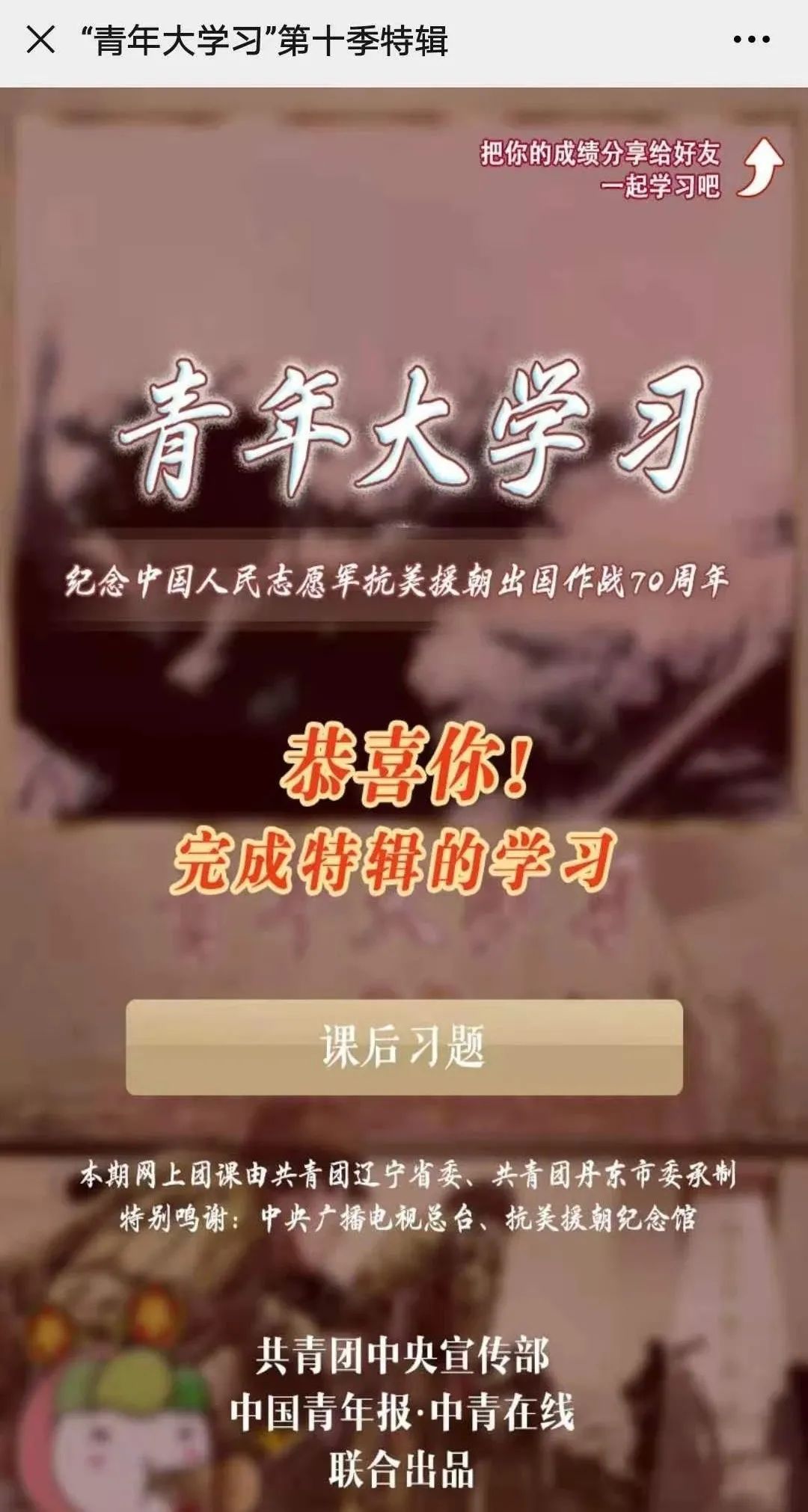 活动中,党支部组织全体党员认真学习了习近平总书记在纪念中国人民志愿军抗美援朝出国作战70周年大会上的重要讲话和青年大学习第十季特辑《纪念中国人民志愿军抗美援朝出国作战70周年》网上主题团课。