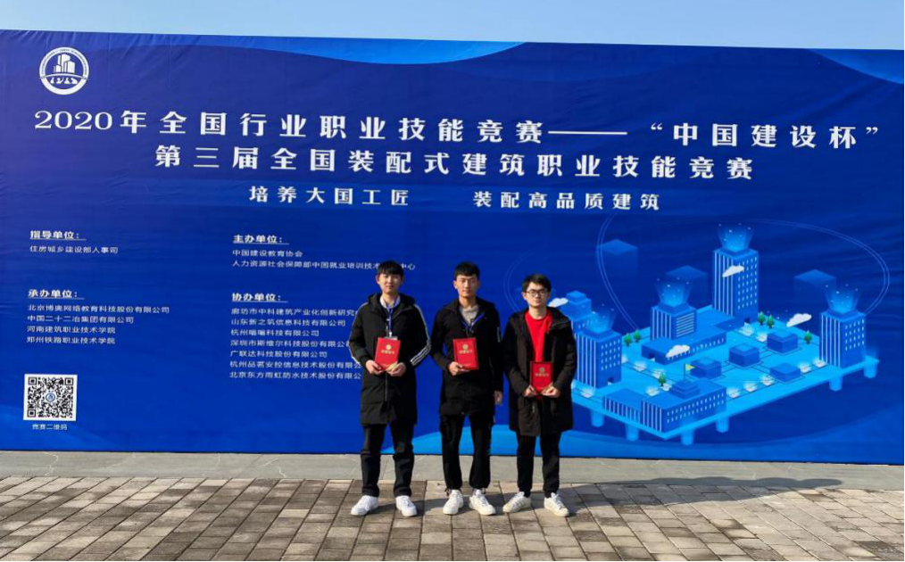 12月4日,2020年“中国建设杯”第三届全国装配式建筑职业技能竞赛(建筑信息模型技术员-安装组)总决赛在郑州铁路职业技术学院举行,由建筑智能学院暖通18-1班彭可、给排18-1班李玮明和杨旭晨同学组成的我校代表队代表江苏省参加比赛,最后以优异的成绩获得了全国总决赛团体赛亚军。申欢迎、夏如杰两位老师获得优秀指导老师奖。