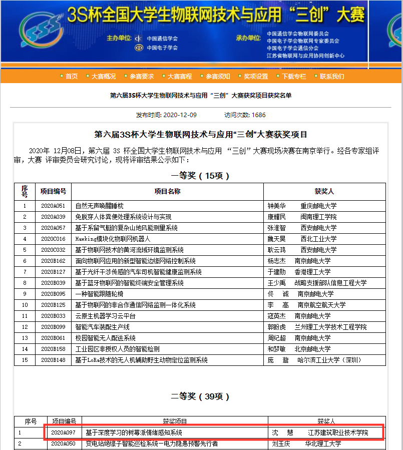 12月7日-11日, 由中国电子学会和中国通信学会主办的第六届3S杯全国大学生物联网技术与应用“三创”大赛决赛在江苏南京市举行。我校信电工程学院报送的项目《基于深度学习的树莓派情绪感知系统》进入现场决赛,参赛学生与多所双一流高校的博士研究生、硕士研究生及本科生同台竞技,获得大赛二等奖第一名,实现我校该项赛事历史突破,也是全国唯一一所获奖的高职院校。