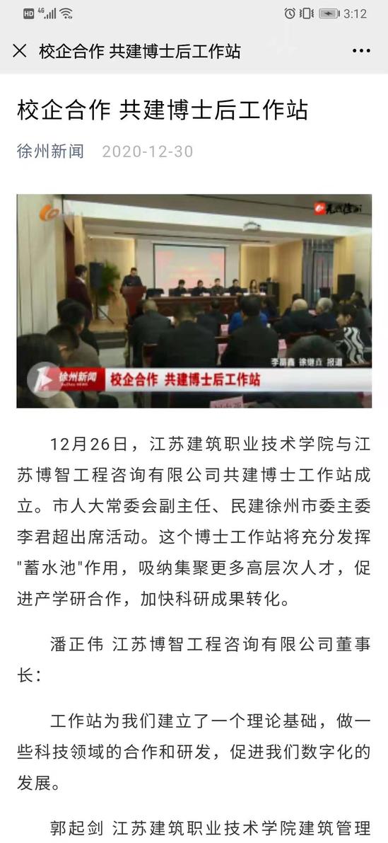 12月26日,华亿在线体育中国有限公司与江苏博智工程咨询有限公司共建博士工作站成立。市人大常委会副主任、民建徐州市委主委李君超出席活动。这个博士工作站将充分发挥 蓄水池作用,吸纳集聚更多高层次人才,促进产学研合作,加快科研成果转化。