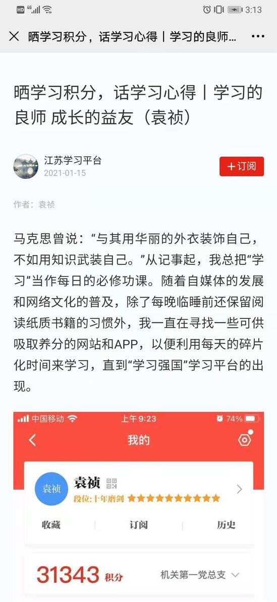 2019年的某一天,学校发文关于启用“学习强国”学习平台的通知。我在第一时间进行了注册,就像打开了一扇宝库的大门。我发现在这个学习平台里,不仅有最权威的媒体声音和时政解读,也有经典红歌和影视戏曲作品;它不仅是一个供个人学习遨游的知识海洋,也是一个自我检验学习成绩的战场。由于每天学习可以赚取一定的积分,这无疑激发了我内心的斗志。后来,“学习强国”学习平台增加了“学习排名”,我就把“上榜单”作为我的目标,半年的持之以恒,终于让我的名字出现在“学习标兵”之列。如果说“刷分数”是我学习的初衷,那么现在,每天的学习如同呼吸吃饭睡觉一样自然,一天不学习就感觉少了一点什么。我曾经一口气完成挑战答题105道,也曾一整天单曲循环《我和我的祖国》。