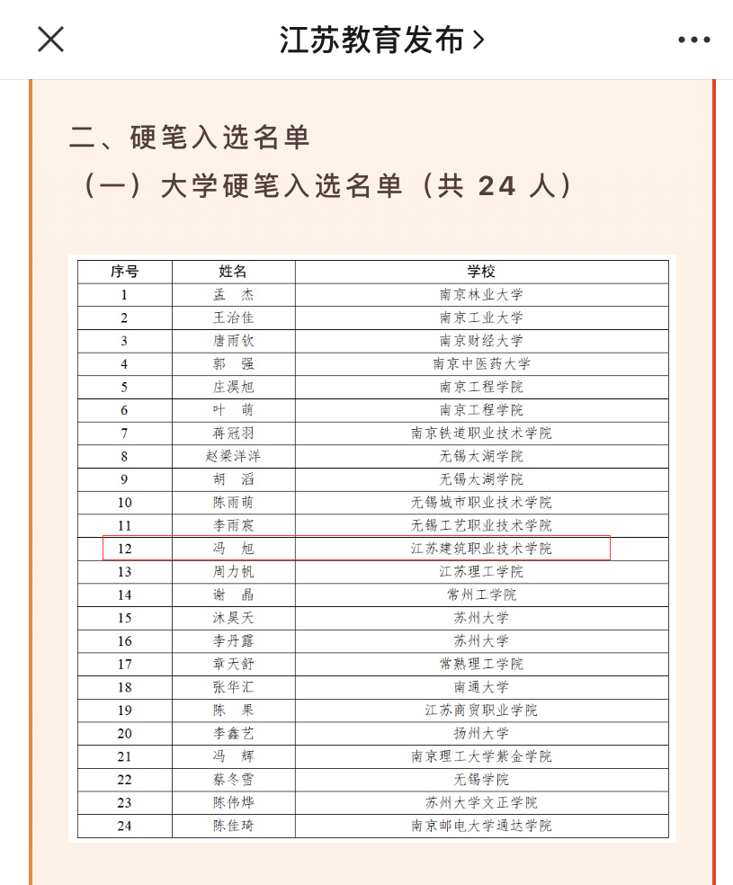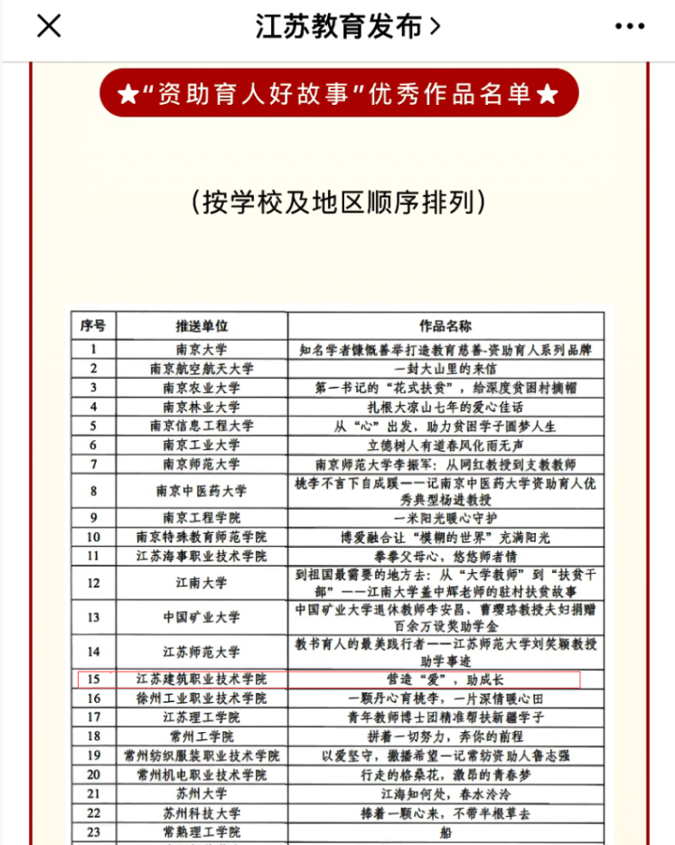 近日,省教育厅办公室印发了《关于开展2020年“苏乡永助”资助育人主题活动的通知》,公布了“苏乡永助”系列资助育人主题活动获奖名单。我校建筑管理学院选送的作品《营造“爱”,助成长》获评资助育人好故事,交通工程学院选送的城运19-4班冯旭同学书法作品《助学筑梦铸人》入选大学组优秀硬笔书法好作品。
