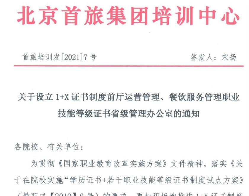 4月3日,教育部职业技能等级证书鉴定发证单位之一北京首旅集团培训中心印发《关于设立1+X证书制度前厅运营管理、餐饮服务管理职业技能等级证书省级管理办公室的通知》,我校经济管理学院成功获批前厅运营管理和餐饮服务管理两个职业技能鉴定省级管理办公室,也是江苏省内唯一的一家承担前厅和餐饮1+X等级证书培训和鉴定的省级管理机构。
