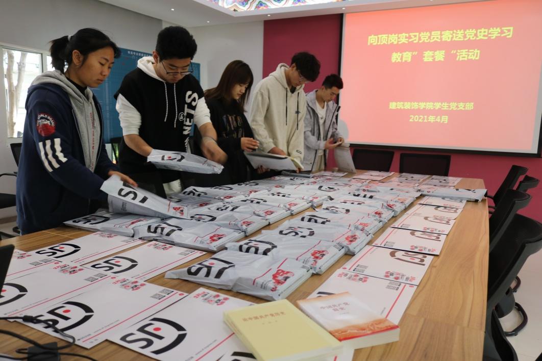 为扎实推动党史学习教育,确保每一名党员“离校不离党、流动不流学”,近日,建筑装饰学院学生党支部将《中国共产党简史》习近平《论中国共产党历史》等4本党史学习教育必读书籍以及《党支部党史学习教育计划》、自行印制的《习近平总书记<论中国共产党历史>摘抄簿》,打包邮寄给30余名外出顶岗实习的学生党员,为他们送去一份“学习套餐”。