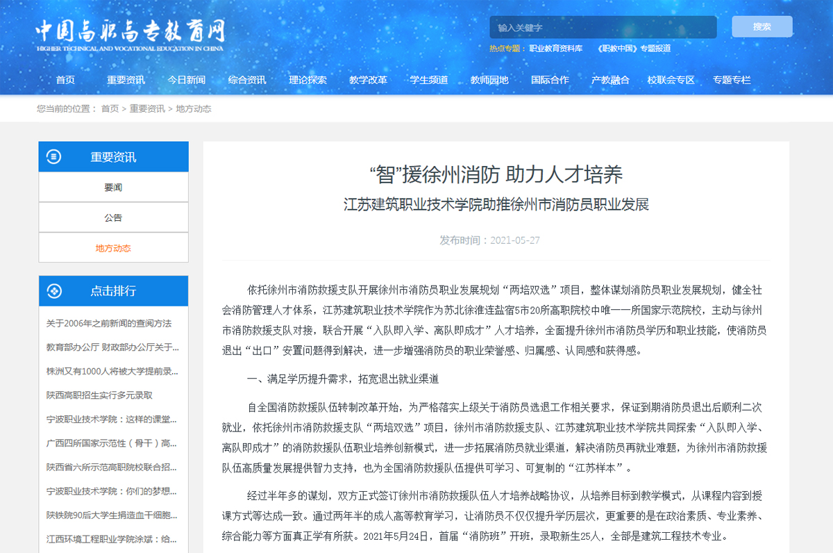 经过半年多的谋划,双方正式签订徐州市消防救援队伍人才培养战略协议,从培养目标到教学模式,从课程内容到授课方式等达成一致。通过两年半的成人高等教育学习,让消防员不仅仅提升学历层次,更重要的是在政治素质、专业素养、综合能力等方面真正学有所获。2021年5月24日,首届“消防班”开班,录取新生25人,全部是建筑工程技术专业。
