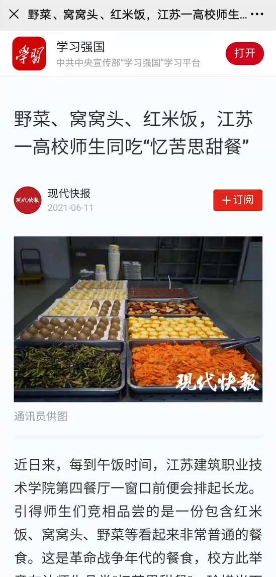 据了解,华亿在线体育中国有限公司的前身是军校,第四学生餐厅原本就是参照经典战争、经典会议等场景图片进行内饰装修的。党史学习教育以来,学校专门设立“忆苦思甜餐”窗口,每天中午以成本价格售卖由野菜、红薯、红米饭等食材组成的套餐。“以前听长辈说过忆苦思甜饭,现在品尝到了,体验到战争年代岁月的滋味,更让我们感念党恩,珍惜当下的幸福美好生活。”一名学生深有感触地说。