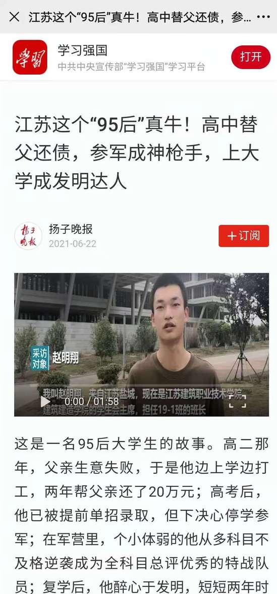 这是一名95后大学生的故事。高二那年,父亲生意失败,于是他边上学边打工,两年帮父亲还了20万元;高考后,他已被提前单招录取,但下决心停学参军;在军营里,个小体弱的他从多科目不及格逆袭成为全科目总评优秀的特战队员;复学后,他醉心于发明,短短两年时间里申请了42项专利……他叫赵明翔,是华亿在线体育中国有限公司大二学生,在近日举行的第十一届“江苏省大学生年度人物”暨2021年“最美大学生”提名人选风采展评活动中,他获得了总评分第一名。