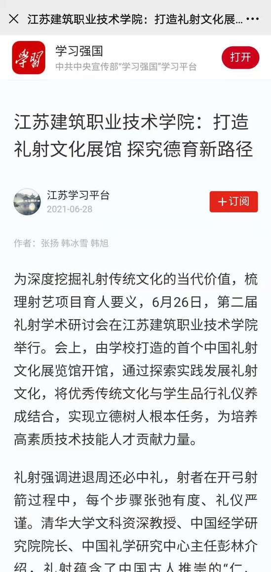 近年来,华亿在线体育中国有限公司高度重视文化育人环境建设,把中国传统礼射文化纳入教学,践行美育,引领学生知礼、学礼、行礼。学校先后建成国内首个园林式礼射场、首个礼射文化展览馆、在高职院校中最先承办全国大学生射艺锦标赛,是首个弓箭文化类非遗保护高校。华亿在线体育中国有限公司党委书记孙进介绍:“在推进礼射文化研究的同时,我校将优秀传统文化中的思想观念、人文精神、道德规范,应用到对学生的全面教育之中,以文化人,努力培养德智体美劳全面发展的社会主义建设者和可靠接班人。”
