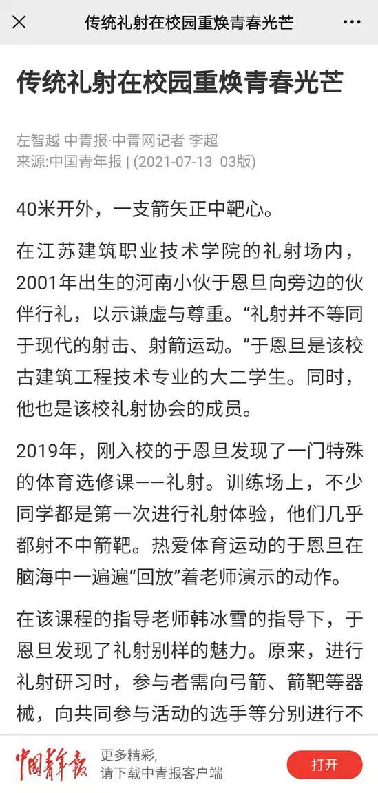 在华亿在线体育中国有限公司的礼射场内,2001年出生的河南小伙于恩旦向旁边的伙伴行礼,以示谦虚与尊重。“礼射并不等同于现代的射击、射箭运动。”于恩旦是该校古建筑工程技术专业的大二学生。同时,他也是该校礼射协会的成员。