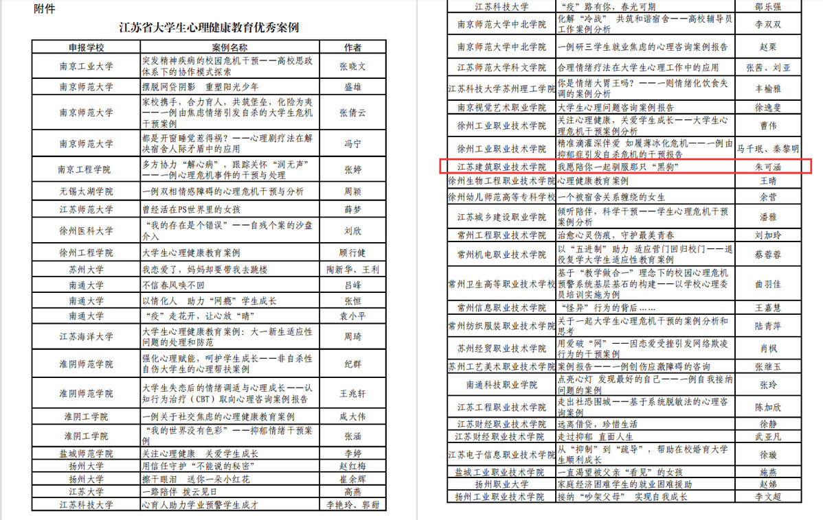 近日,从江苏省教育厅获悉,在省教育厅高校学生处与教育宣传中心联合开展的“全省高校大学生心理健康教育优秀案例征集”活动中,我校朱可涵老师提交的关于抑郁症干预的案例——《我愿陪你一起驯服那只“黑狗”》脱颖而出,被评选为“江苏省大学生心理健康教育优秀案例”。