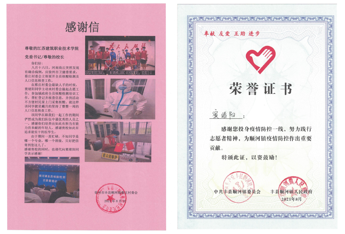 近日,我校智能制造学院机电20-5班窦绪阳同学收到了由徐州市丰县顺河镇蔡庄村寄来的感谢信和荣誉证书,信中对其投身疫情防控一线、努力践行志愿者精神的行为表示感谢和鼓励!