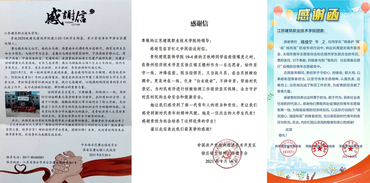 近日,我校陆续收到了来自共青团无锡市委、共青团鹿邑县委等多家单位发来的感谢信,信中表达了对我校青年学子在暑假期间抗击新冠肺炎疫情期间勇于担当、甘于奉献精神的感谢。截至日前,我校共收到125件来自全国各地团组织、街道、社区发来的感谢信、志愿服务时长证明等材料。